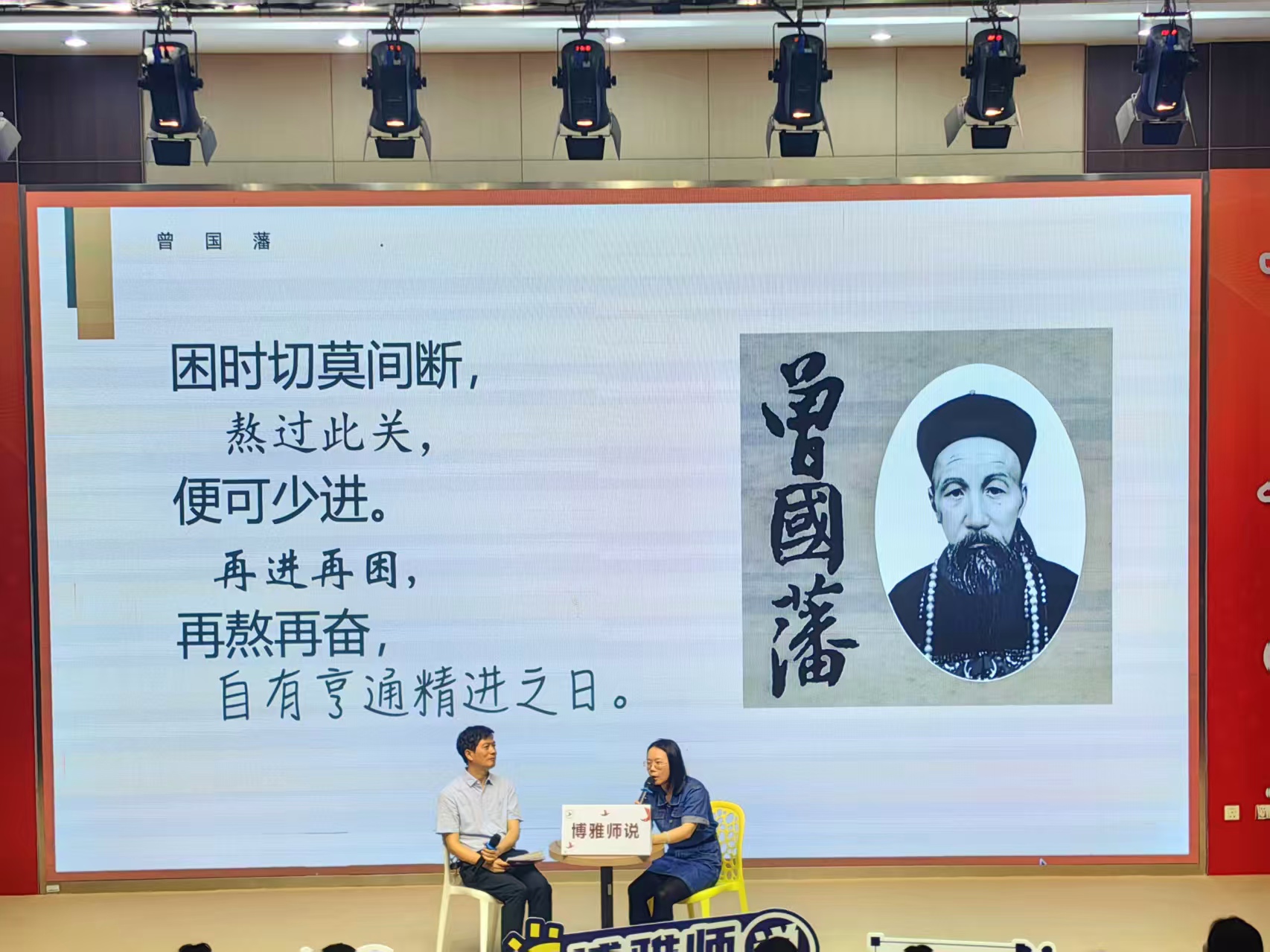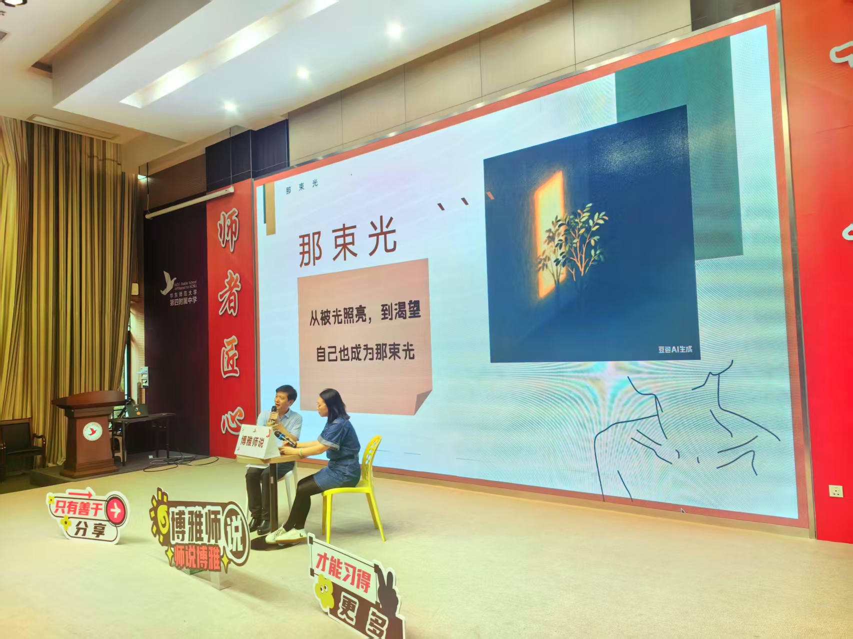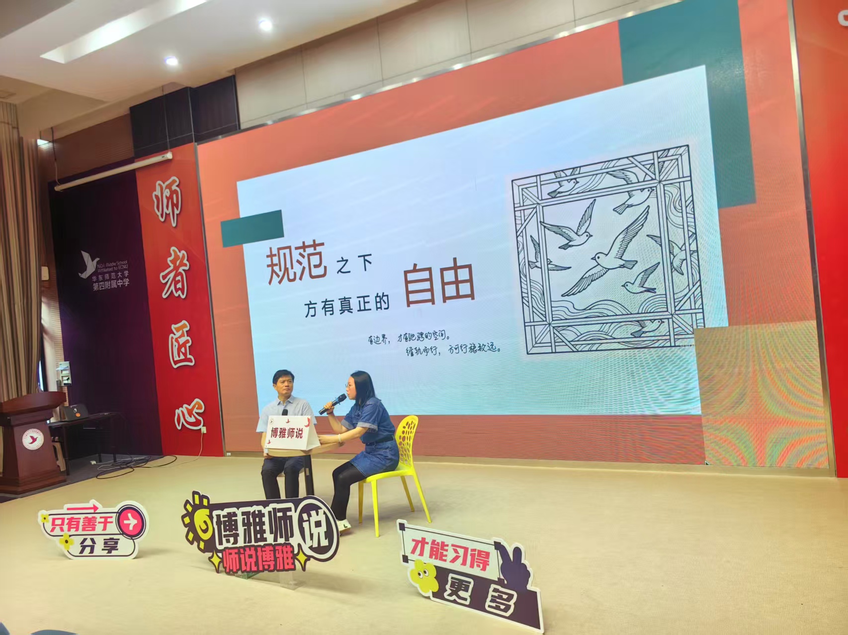 2025年10月10日,华师大四附中校长眭定忠与初中英语教研组长李睿婉,以“一堂课,一份坚持,一场蜕变——青年教师成长中的关键事件”为主题,面向全体教师,以访谈的形式带来了华四第二期“博雅师说”。