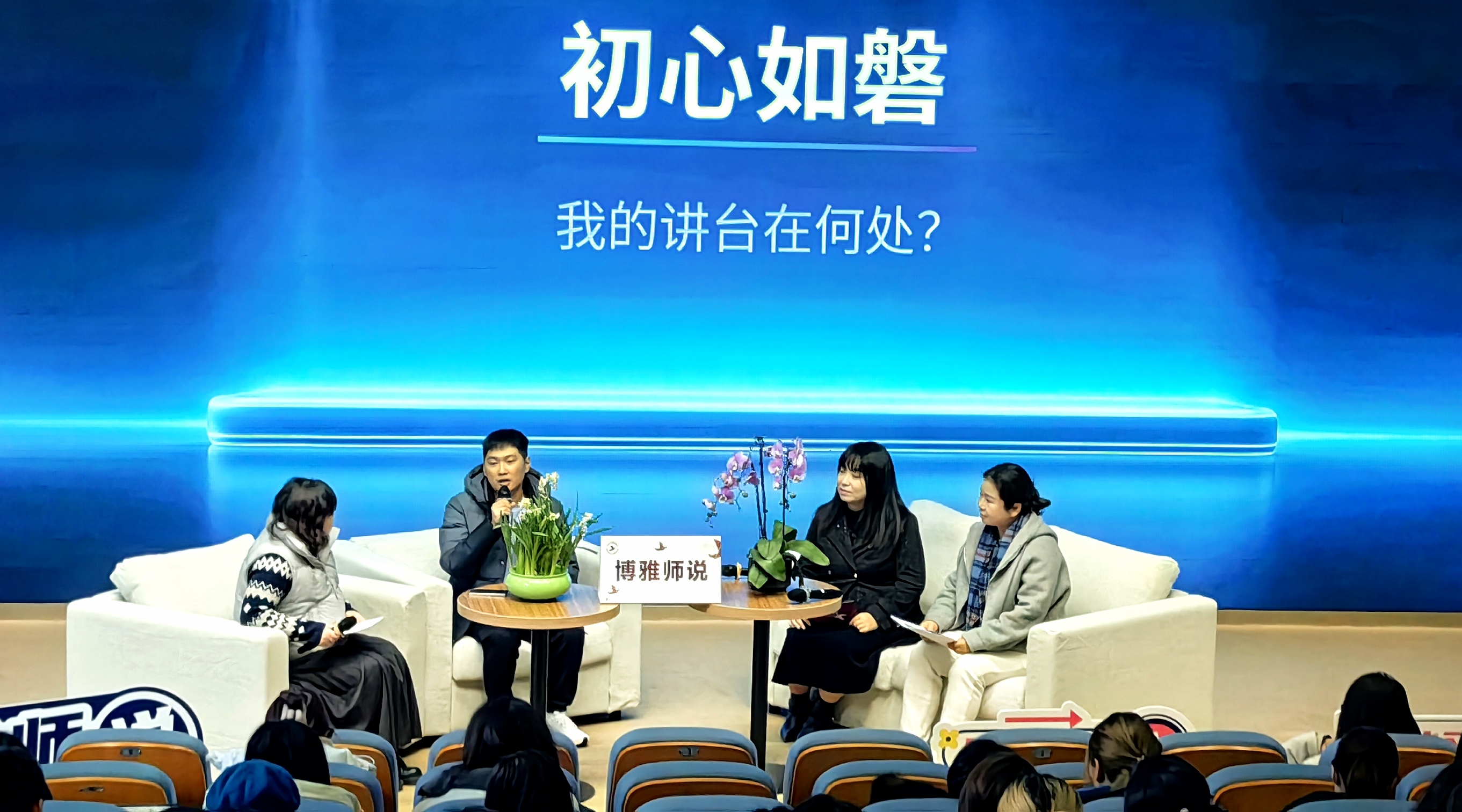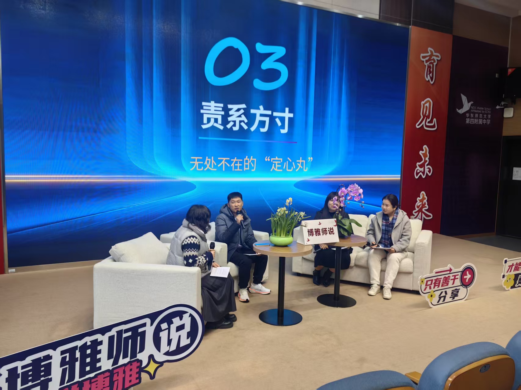 2026年1月28日,华师大四附中第四期“博雅师说”如期而至,本期博雅师说主持人张小芳,对话人薛滢,嘉宾陈功,特邀嘉宾杨玉婧、吴旻晴、陈佳寅、高晓骏,聚焦科研信息部技术骨干陈功老师,通过访谈与同事分享,探寻这位“幕后英雄”如何以技术为桥、以服务为责,在平凡岗位上书写育人初心的故事。