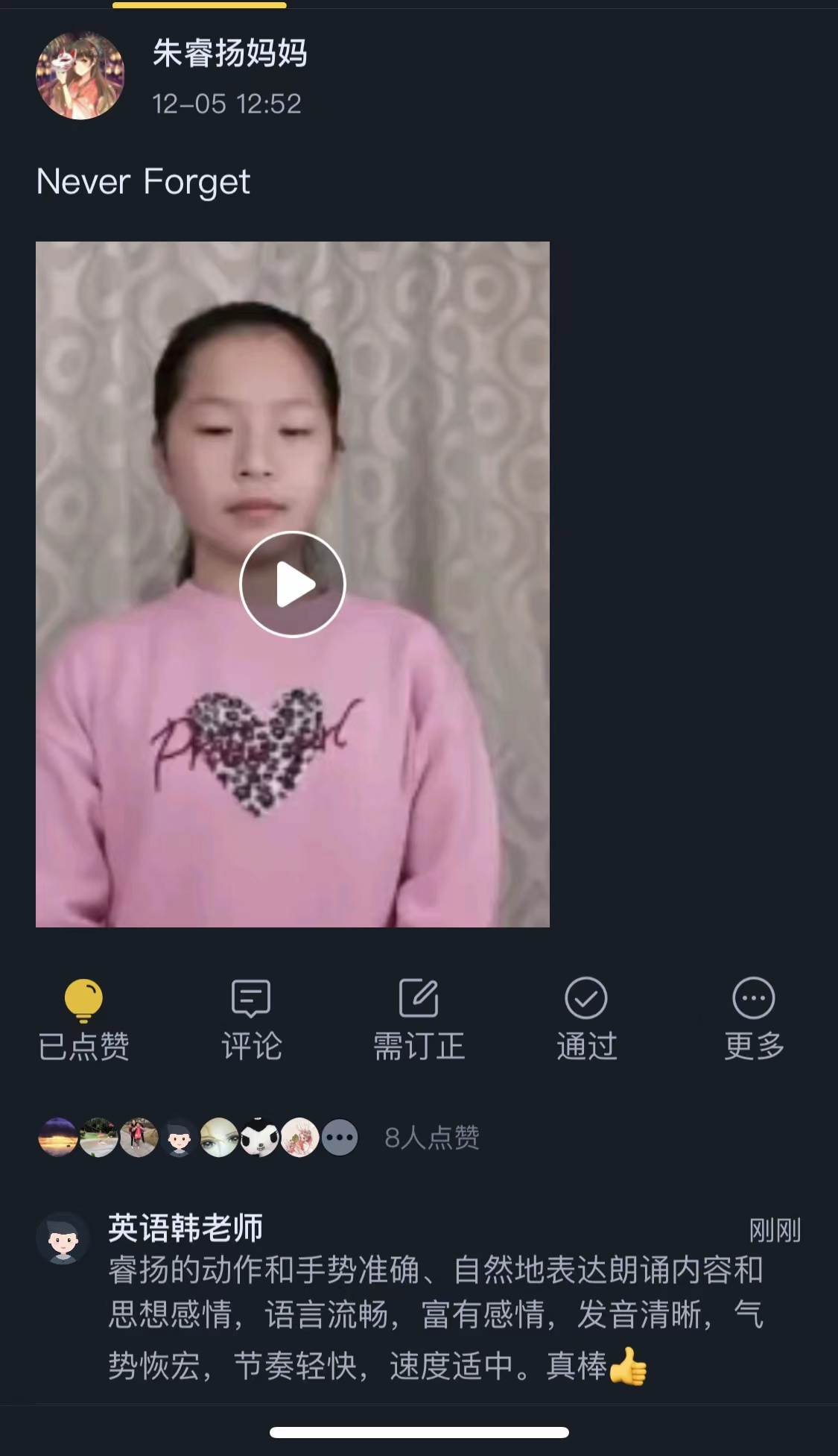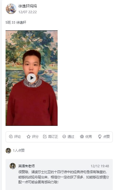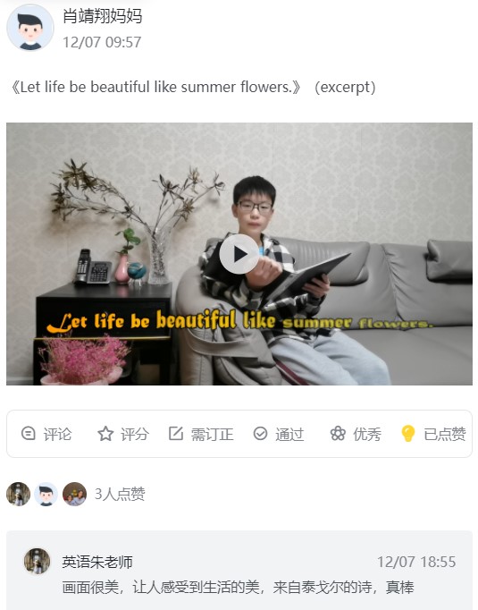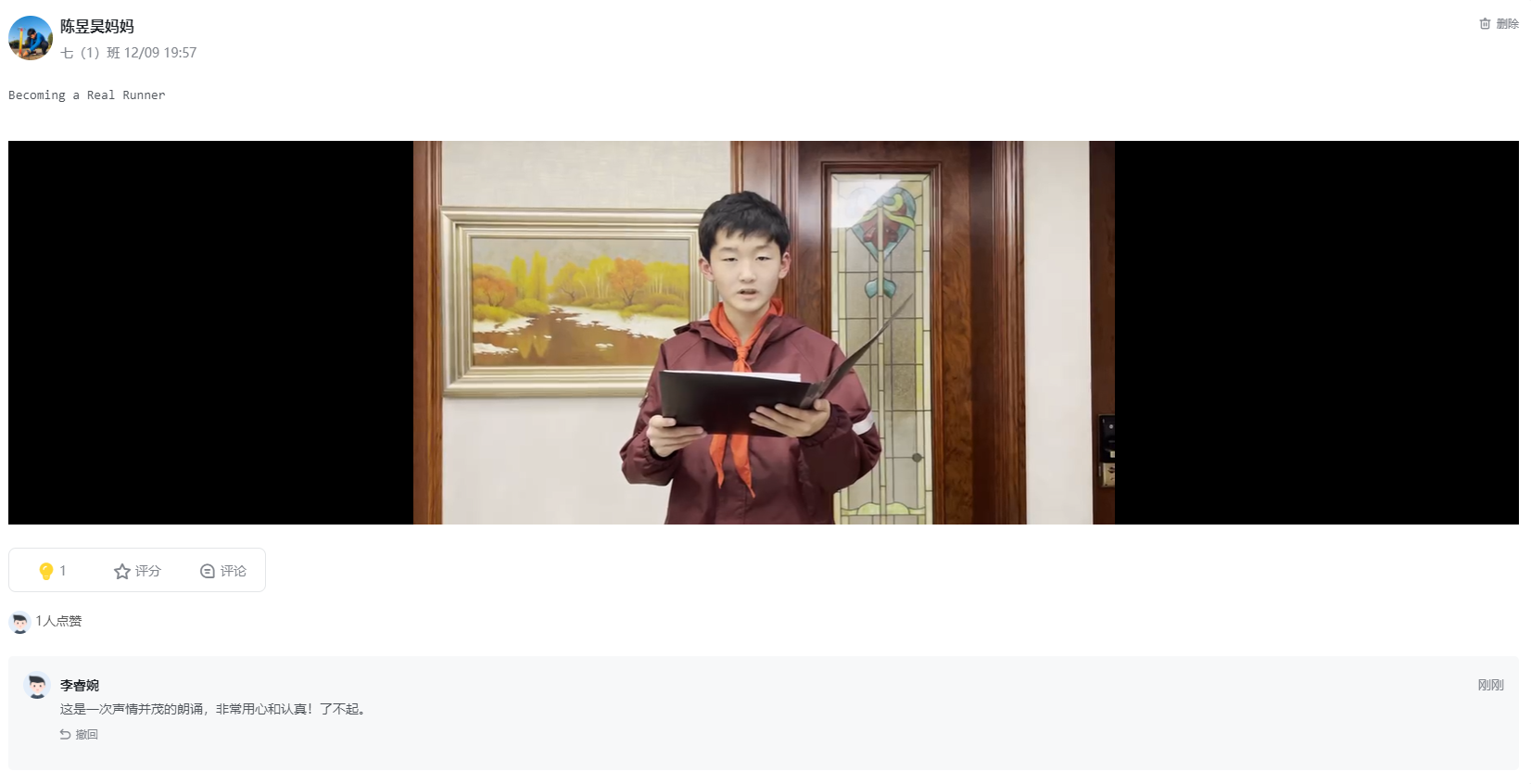 以“青春之声 ‘声’入人心”为主题的七年级学生英语美文诵读活动,于12月初拉开序幕,历时两周。同学们或自选素材或选择教师推荐美文,诵读录制成视频并上传至班级群,同伴和老师即时观看、实时点评。每个孩子都用自己的声音和视角去读懂美文,感悟美文,表达自己对美文的理解。